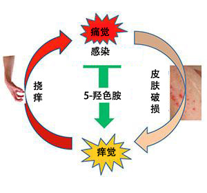“越挠越痒”示意图。当人感到痒时,就会去抓挠;而抓挠造成痛感时就会刺激5-羟色胺的释放,以缓解疼痛;但是5-羟色胺本身会促使痒神经元的信息传递,结果就是越挠越痒。图片来源:eurekalert.com 基于以上结果,研究人员提出了5-HT/5-HT1A在“越挠越痒”这一循环中的作用——挠痒产生的疼痛会刺激大脑释放5-HT以减轻痛感。但在这一过程中,5-HT会同时激活GRPR神经元中的5-HT1A受体,后者则与GRPR受体联络,促使痒神经元的信息传递,从而让人感到更痒,更要使劲得抓,这样,大脑就会释放更多的5-HT去控制痛觉,同时有促进痒的信号放大。所以5-HT在痛觉和痒觉调节过程中的双重作用,就导致了“越挠越痒”的恶性循环。
